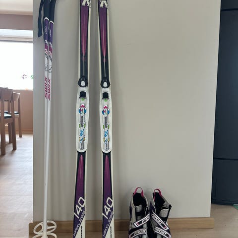 Madshus Frost Skipakke. Pent brukt. Som nytt. Madshus Frost langrennsski med tilhørende skisko fra Alpina og staver. Skiene har bindingssystem tilpasset skoene. Skoene har et uttagbart fôr med isolerende materiale for god varme, og borrelås for justering. Staver med kurv for bruk i snø. Passer for langrenn og turløping på snø. Vi kjøpte dette nytt, og det er pent brukt av våre to barn.