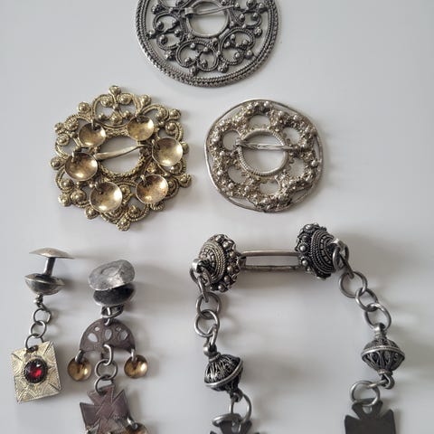Diverse Sølv m.emalje vintage og en ørepynt fra Huldresølv m.sten.