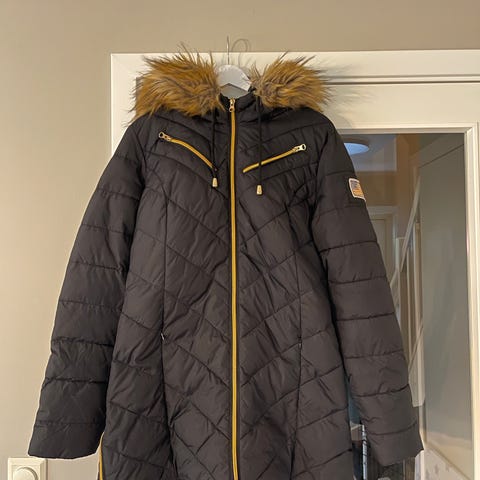 Svea Vinterjakke i størrelse M for kvinner. Jakken er svart og laget av polyester. Den har hette med pelskant og flere lommer. Egnet for kaldt vær.
