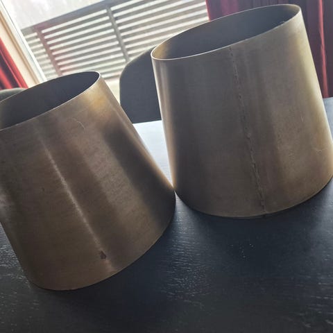 Stor lampeskjerm 57 cm høy og liten lampeskjerm til lampett 13 cm høy. Fin gammelrosa farge. Kr. 300 for begge.