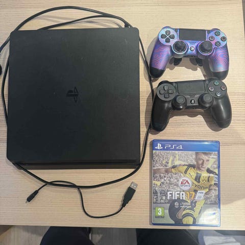 Playstation 5 konsoll med tilhørende spill. Spillene inkluderer flere titler i ulike sjangre, som gir variasjon i spillopplevelsen. Konsollen er designet for hjemmeunderholdning og spillbruk.