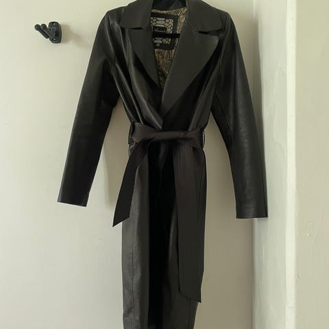 Kåpe i skinn, størrelse L, i svart farge. Kåpen har dobbelspent knappestolpe og belte i livet for justering. Designet for kvinner.