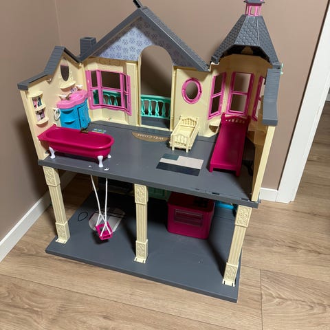 3 etasjer med separat garasje. Mål: 84cm bredde, 125 cm høyde, dybde:33cm. Garasjen er 32 cm bred
