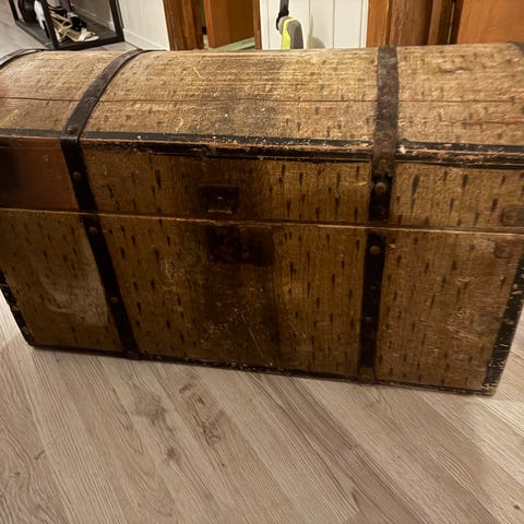 Blå dekorativ kiste laget av tre med metallhåndtak på lokket. Kisten har buet lokk og er malt med blå, svarte og gule detaljer. Innvendig er kisten malt i turkis. Egnet for oppbevaring av ulike gjenstander.
