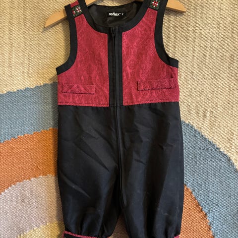 Reflex festdrakt i størrelse 86 for jente, laget av bomull. Bunaden har flerfarget design og inkluderer skjorte, liv, skjørt og forkle.
