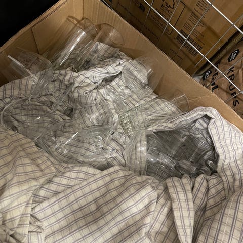Mugge og glass er i krystall fra serien "Gjest", produsert av Hadeland Glassverk.