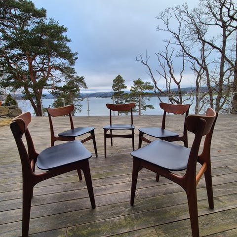 Stolene er utført i teak med sete og rygg i sort skai, og har et elegant og solid uttrykk. De er i meget god stand i både teak treverket og skaiet. Det finnes noen få, ubetydelige små merker, men disse er helt normale og forventede bruksspor og påvirker ikke helhetsinntrykket – se bilder og vurder selv. Fremstår som utrolig fine og elegante stoler. Ikke ofte å finne 2 like av disse.