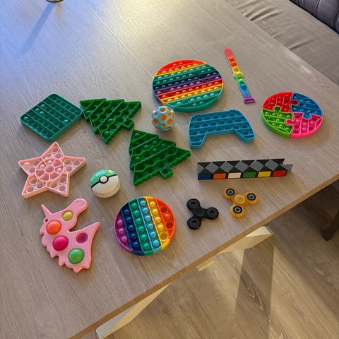 8 stk. Pop It lekeboble sett med assorterte farger og former. Settet inneholder ulike figurer som stjerne, hjerte, dinosaur, enhjørning, og flere i materialet silikon. Passer for barn og voksne som stressavlastning. 50 nok for en eller 250 samlet
