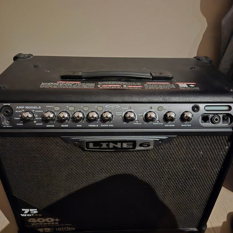 Line 6 Spider IV 15 gitarutstyr med innebygde effekter og forsterkerfunksjoner. Utstyrt med flere kontrollknapper for justering av lyd, tone og effekter. Passer for gitarister som trenger en kompakt og allsidig forsterkerløsning.