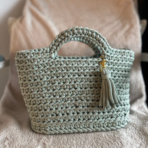 Vesken er håndheklet og kombinerer et solid, heklet uttrykk med myk fuskepels, noe som gir et eksklusivt og tidløst preg. Den passer like godt til hverdagsbruk som til mer pyntede anledninger.