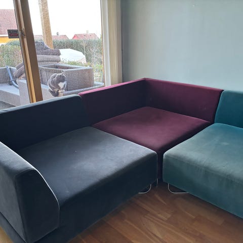 2 seter sofa og puff. Sofaen har sittehøyde 39 cm, puffen er 59x68cm, høyde 39cm. Stoffet er slitt, men fjærene og setene i god stand. Setene er ikke nedsunket.