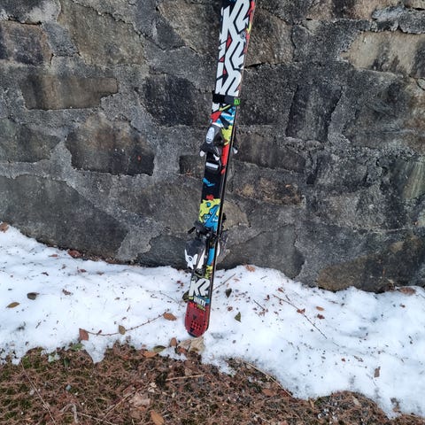 Twintip K2 med bindinger - «badapple» - relativt tunge kvalitetski, svært godt likt for kjøring i terreng.