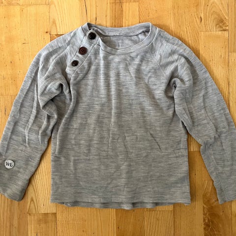 Woolland ulltrøye str 110/116.Genseren har rysjedetaljer på skuldrene og brodert tekst på brystet. Noen flekker foran og et lite hull på ermet. Se bildene.
