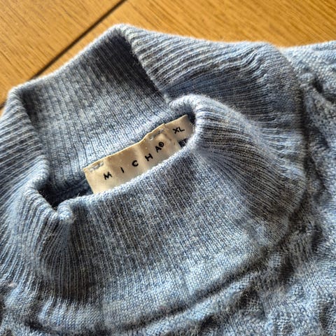 Høyhalset genser i ekstra myk finstrikket 100% merinoull. Genseren har bred, ribbestrikket kant rundt ermeåpningene og nederst på plagget.