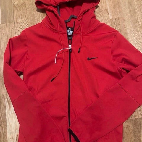 Selger en svart Nike treningsskjorte i størrelse M. Den har et stort hvitt Swoosh‑logo på brystet og mesh‑paneler på skuldre og sider for bedre ventilasjon. Stoffet er lett, pustende og perfekt til både trening og hverdagsbruk.