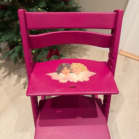Stokke høy barnestol laget i tre med justerbare deler for tilpasning etter barnets størrelse. Stolen er designet for barn og gir støtte og sikkerhet ved spisebordet.