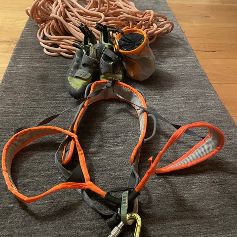 Klatrepakken inneholder Garra klatresko i størrelse 38 (små i størrelsen), klatresele fra PETZL (size 1), samt to stykk karbinkroker, brems og oppbevaringspose.