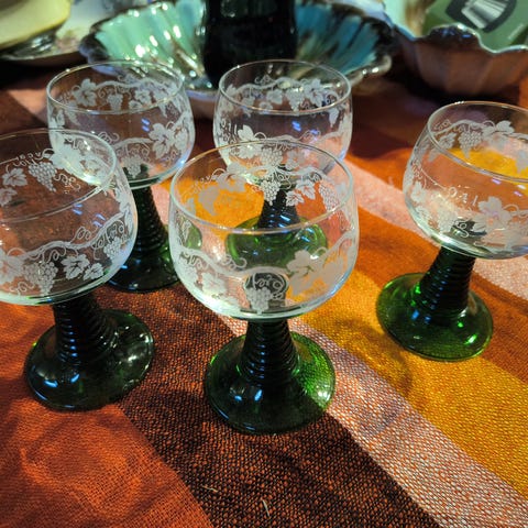 Veldig pene glass uten feil eller mangler. Brun/gul stett. Ca. 10,5/11 cm høy. 0,1 liter kapasitet.