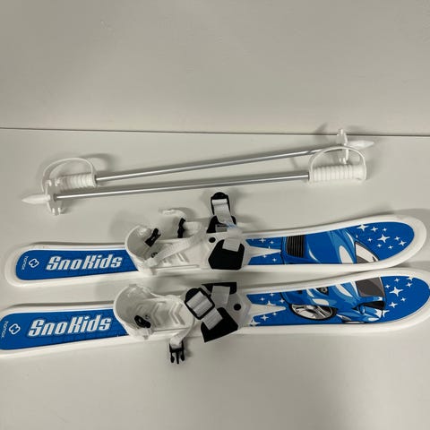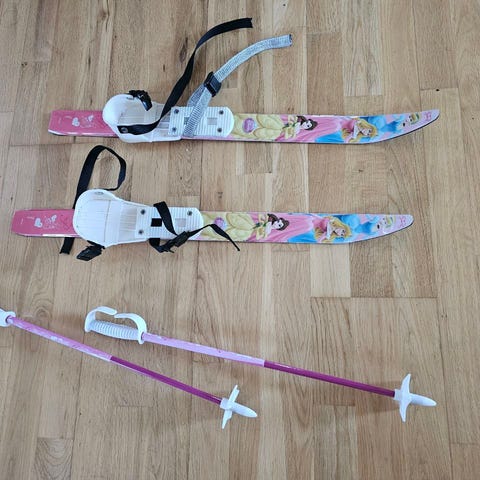 Disney skisett med staver, lengde 80 cm, rosa farge med dekorative mønstre. Passer for de minste barna. Brukes uten skisko. Dvs kan brukes med alle typer vintersko.