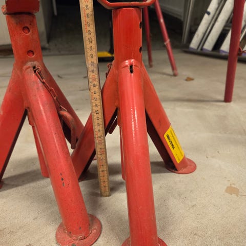 Biltema støttebukker med kapasitet på 2 tonn. Laget i gul metall. Brukes til å støtte kjøretøy ved arbeid under bilen for økt sikkerhet.