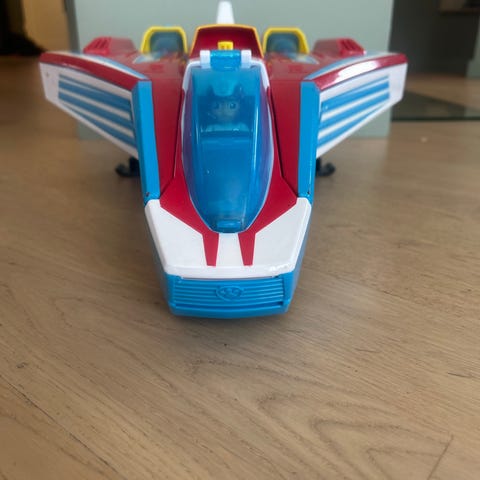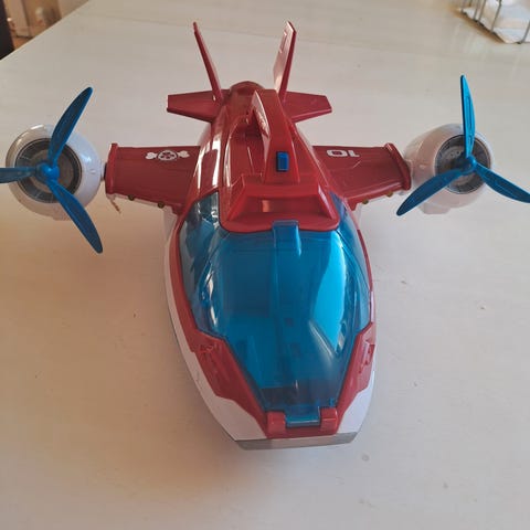 Paw Patrol leketøysfly i rødt, hvitt og blått med plass til en figur i cockpiten. Flyet har detaljer som cockpitluke og plass til flere seter. Egnet for barn som liker lek med figurer og kjøretøy fra Paw Patrol-serien.