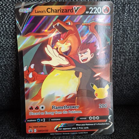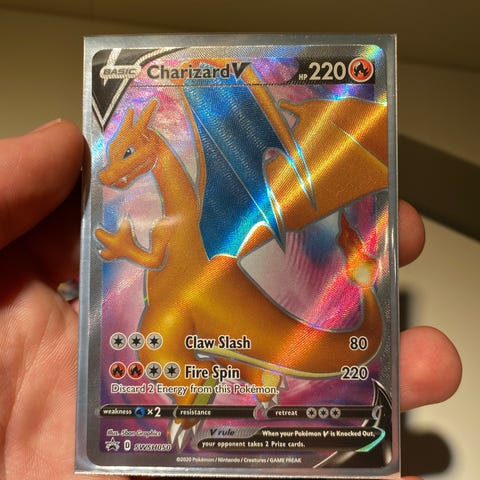 Pokémon Charizard V samlekort med 220 HP. Kortet viser Charizard med flammeeffekt og har angrepet Flamethrower med 260 skade.
