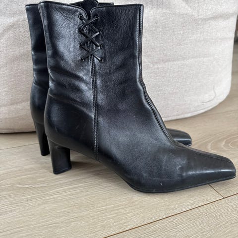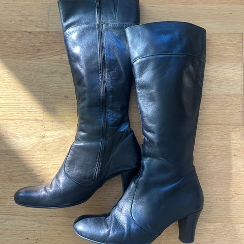 Gabor skinnstøvletter i størrelse 40,5 (7), farge svart. Støvlene har glidelås på innsiden for enkel på- og avkledning. Glidelås bak legg for å utvide bredde.