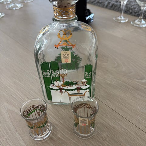 Holmegaard glasskaraffel selges med julemotiv. Det er en kalender på venstre side av flasken. Følger med to glass til karaffelen. Må hentes