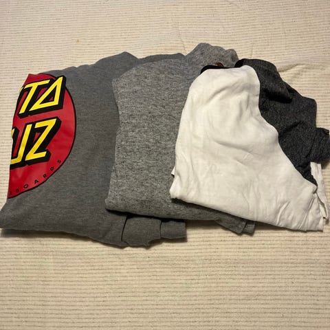 De kommer stort sett fra H&M. Noen pent brukt, andre ikke brukt, med lappen på.