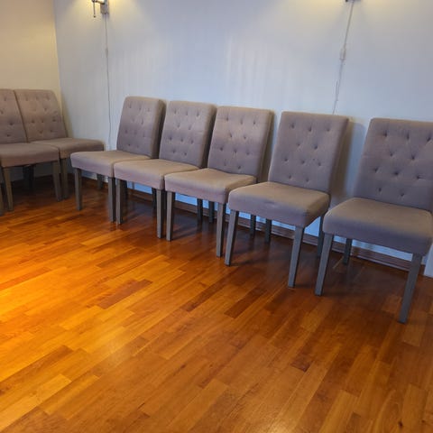 Seks spisestuestoler fra IKEA selges. Stolene er gode å sitte på, og trekket har vært enkelt å bytte ved behov. H: Rygg 100cm, sete 48cm, D:40cm, B 43cm. Selges samlet til 350 kr
