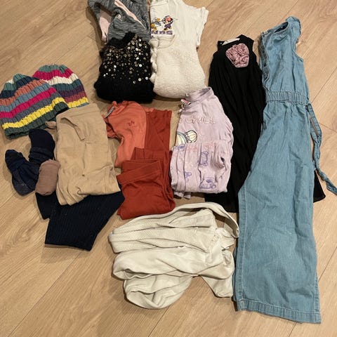 Fleecejakke 4 gensere 3 kjoler e pappa heldress/shorts 1 tightsshorts 1 skjørt 1 morgenkåpe