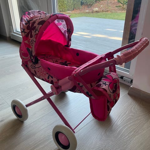 Dukkevogn i rosa farge. Brukt utendørs, så har litt rust.