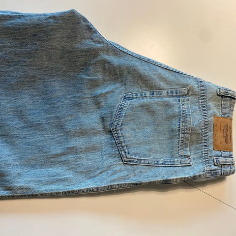 (Ikke american vintage) Shaqiru jeans i blå farge, størrelse W28 og S. Laget av 100% bomull. Designet for kvinner. Har ett hull foran som kan syes igjenn!