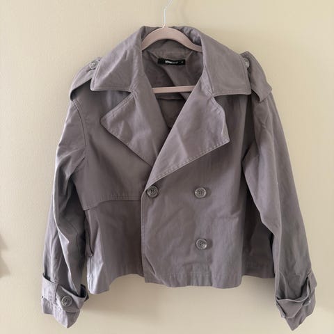 Klassisk gråfarget ytterjakke med lommer og knapper for lukking. Størrelse XS.