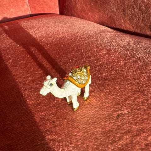 Vintage dekorativ anheng/pynt med fargerik sommerfugl- og blomsterdekor, kombinert med rød tekstildusk. Utført i metall med emaljelignende overflate, i klassisk asiatisk/inspirert stil.