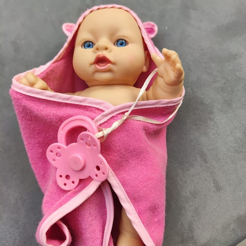 Baby Born dukke med rosa lue og rosa- og hvitstripete shorts. Dukken har realistiske ansiktstrekk. Knapt brukt.