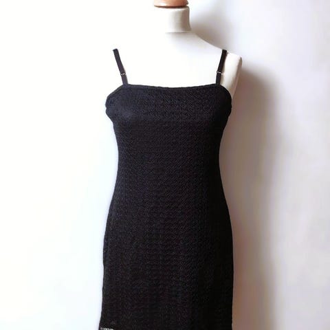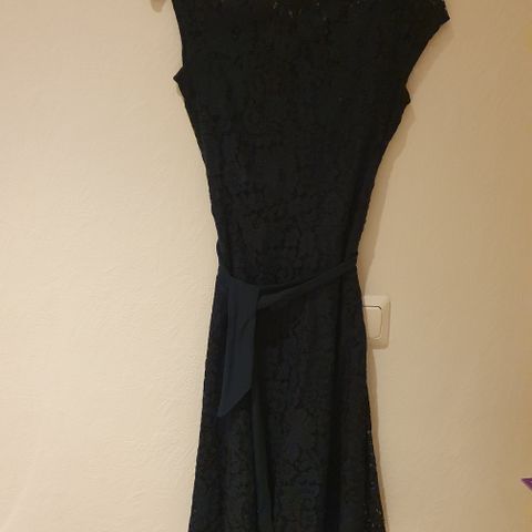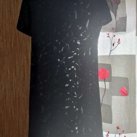 KappAhl festkjole i størrelse 36, svart farge og laget av polyester. Kjolen har detaljer som puffede ermer og flott mønster. Glidelås i siden.