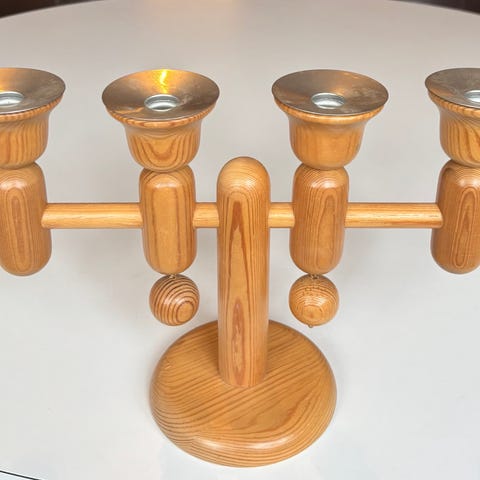 Aarikka dekorasjonsornament lysestake laget av metall. Ornamentet er utformet med detaljer i form av hjul og en figur, og har plass til tre lys. Den er egnet for dekorasjon og kan henges opp.