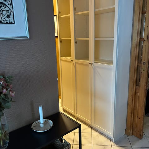 Selger et pent brukt skap fra IKEA. Det er en Billy bokhylle med glassdører. Ingen synlige bruksmerker. Selges på grunn av plassmangel.