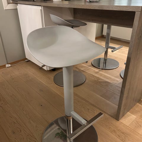 2 barstoler som kan heves og senkes selges for 900kr samlet. Stolene må hentes