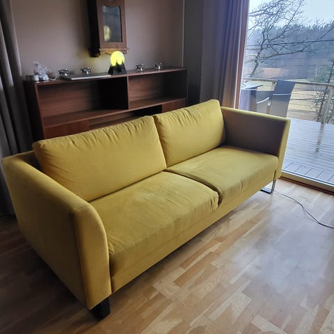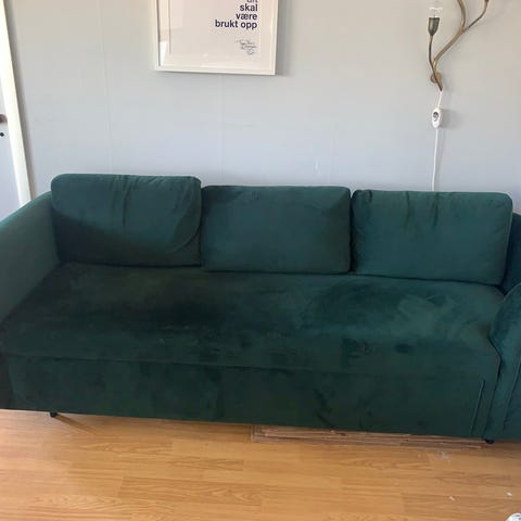 Sofaen har en liten rift som ikke er synlig nederst ved sofa delen. Kan lett ta gul tråd så synes det ikke. Men synes ikke det synes nå. Har ekstra beskyttelses stoff til alle armlene. Ikke slitt - god stand
