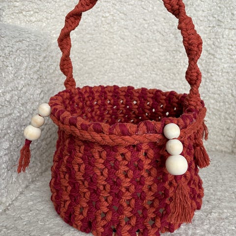 Kurven er laget av bomullssnorer i makramé og dekorert med trekuler, som gir et naturlig og bohemsk uttrykk.