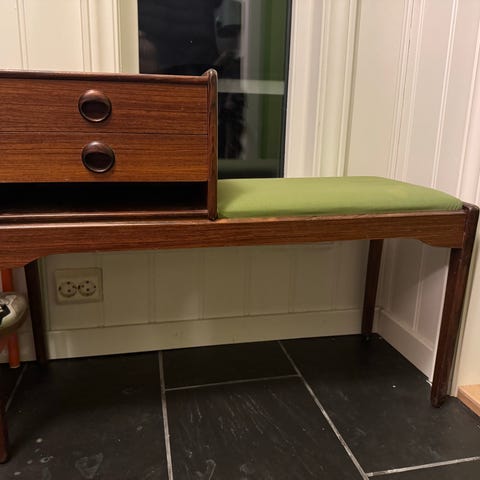 Gammelt sybord i teak med en skuff og et oppbevaringsrom under bordplaten. Skuffen er delt opp med flere rom for organisering. Bordet har en enkel og funksjonell design, egnet for bruk som sidebord
