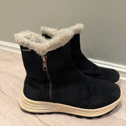 Superfit barnesko for jente i størrelse 34. Skoene er svarte med myk, varm fôr på innsiden og har spenne- og glidelåslukking. Yttersålen har mønster for bedre grep.