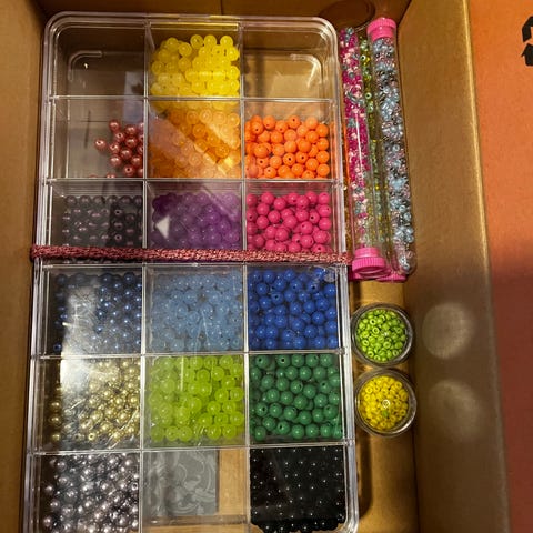 Assorterte perler til å lage smykke med selges. 11 poser med ulike farger + en pose med bokstaver og tre nøster med tråd.