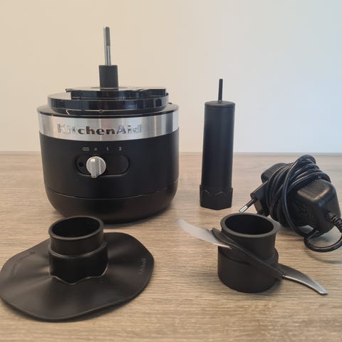 KitchenAid Food Processor i svart farge. Kommer med en gjennomsiktig beholder og lokk med åpning. Utstyrt med håndtak for enkel bruk og kontrollknapp på siden. Passer til ulike matlagingsoppgaver som hakking, kutting og blanding. Ny pris kr 1199.