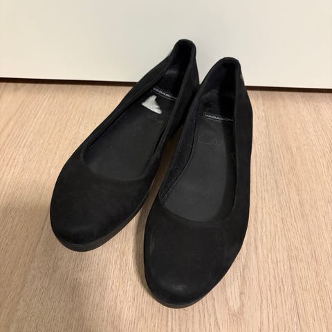 Vagabond ballerinasko i størrelse 40, svart farge. Skoene har en enkel og klassisk design med en gummisåle som gir godt grep. Materialet ser ut til å være semsket skinn eller lignende, med en myk innside for komfort. Passer til daglig bruk og ulike anledninger.