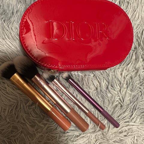 Dior sminkeveske med børstesett. Dior sminkepung i rød farge, laget av tekstilmateriale.