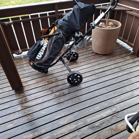 Alt er pent brukt, og tørket av og rengjort etter hver runde. Er utrolig lett å ta av og på bag fra tralle til å pakke inn i bilen. Baggen kan fint brukes uten trallen.