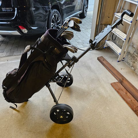 Det som følger med er en hel del ekstra ting som tees, baller, myke-skum baller, håndkle, børste, greengaffel og driververktøy. Følger også med en brukt hanske som funker fint. (strl M)